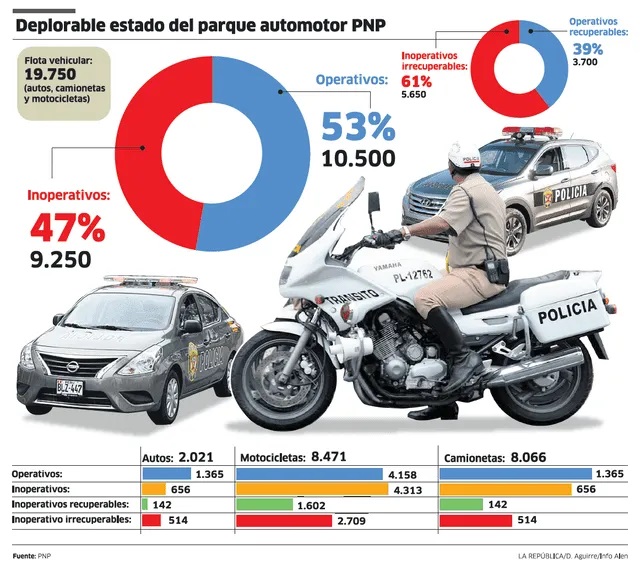 De acuerdo con fuentes de la Dirección de Logística de la PNP, la institución cuenta con 19.750 vehículos, entre patrulleros, autos, camionetas y motocicletas. De ese total, solo 10.500 unidades (53%) están operativas, mientras que otras 9.250 (47%) están en condición de inoperativas. Ahora bien, de los 9.250 vehículos inoperativos, alrededor de 3.700 son recuperables y 5.650 son irrecuperables. Es decir, más del 50% están obsoleto.