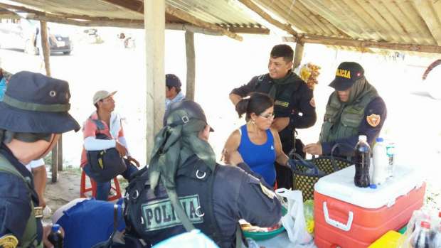 A las dos de esta tarde los productores de arroz que llegaron al Óvalo del Periodista en La Banda de Shilcayo almorzaron en los puestos de venta de comida de la zona, a los pocos minutos agentes policiales de la Unidad de Servicios Especiales de la Policía Nacional también hicieron lo mismo y se mezclaron entre ellos bajo un ambiente sin ningún tipo de conflicto.