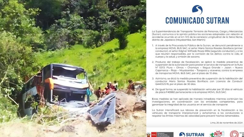 Ante la tragedia en Moyobamba, la Sutrán denunció a la empresa Movil Bus y al conductor que manejó el vehículo el día del siniestro.