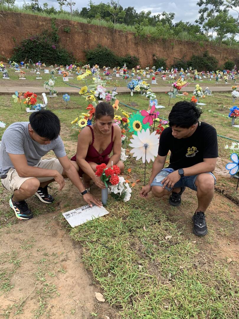 VOCES acompañó a la familia al campo santo donde reposan los restos de Quinto Inuma, juntos acompañando a la esposa, sus hijos y nieta, nos dirigimos a  la tumba confundidos de angustia y dolor, la familia eleva sus oraciones al infinito,  al Dios de Quinto, al Dios de todas la culturas, al Dios de los bosques y la madre naturaleza,  a nuestro Dios, su esposa Betty Marlith Mandruma, sujeta de la manos a sus hijos memores R. I. M A. J. I. M, ahí está Kevin Arnol y Gean Pierre Inuma Mandruma, invadidos por la nostalgia y la tristeza junto a la tumba de Quinto, a la madre de sus hijos y a ellos le brotan lágrimas, sollozos de dolor, el consuelo de sus hijos están intentando dar fortaleza a mamá, guardando la distancia y respeto observamos la doliente escena, es el resultado de la codicia de la avaricia que acarrea la violencia, es la bendita violencia que hiere el cuerpo del que la sufre, de los que lloran, es el llanto de una cultura,  como nos dice nuestro poeta Vallejo en Los Heraldos Negros: