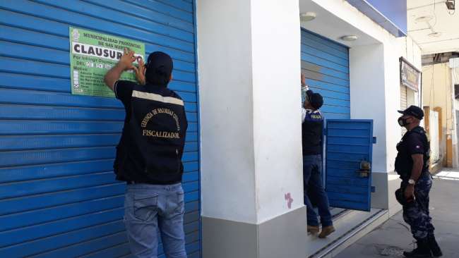El primer local en ser clausurado fue una empresa de telefonía móvil que está ubicada en la cuadra uno del jirón Augusto B. Leguía, en pleno centro de Tarapoto. En el lugar el personal laboraba con total normalidad sin tener en cuenta las restricciones sanitarias. Los trabajadores tuvieron que salir y retornar a sus domicilios.