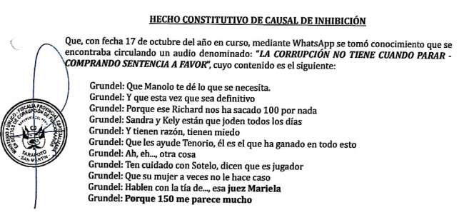 De acuerdo a la transcripción de dicho audio propagado el 17 de octubre, vía WhatsApp y Facebook, se menciona a un interlocutor que sería Walter Grundel Jiménez, referir hacer un pago de 150 a una juez de nombre Mariela y tener cuidado con su esposo de apellido Sotelo, datos que coincidirían con la precitada magistrada y su esposo.