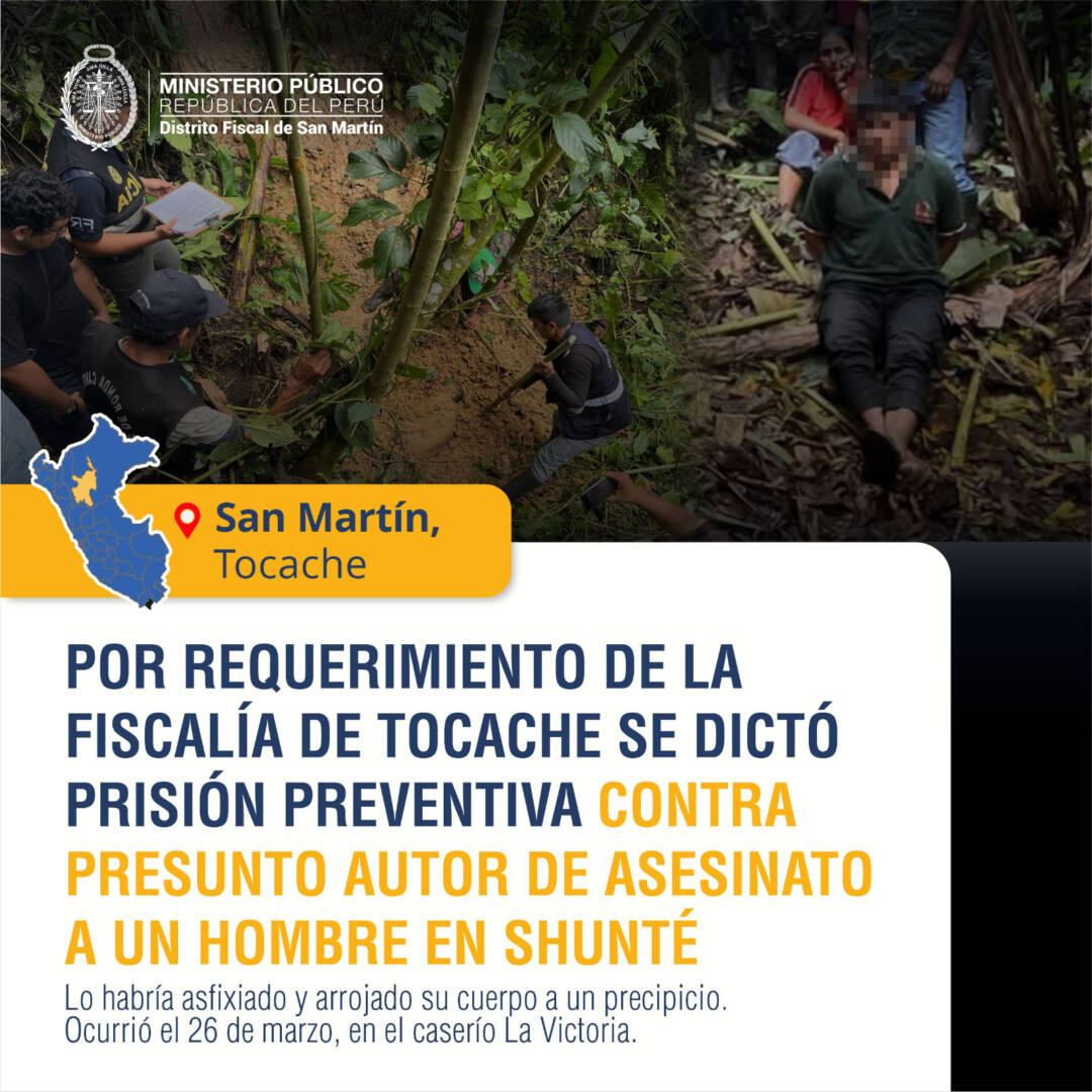 Por requerimiento de la Fiscalía Provincial Penal de Tocache, el Poder Judicial dictó nueve meses de prisión preventiva contra Tito Hernández Albújar (38), presunto autor del delito de homicidio calificado en agravio de Alan Kenner Medina Flores (40), quien, el 26 de marzo del año en curso, fue estrangulado y su cuerpo arrojado a un precipicio en la zona de Shunté, provincia de Tocache, San Martín.