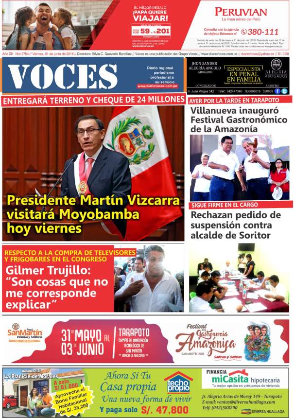 Portada del día Viernes 01 de Junio del 2018