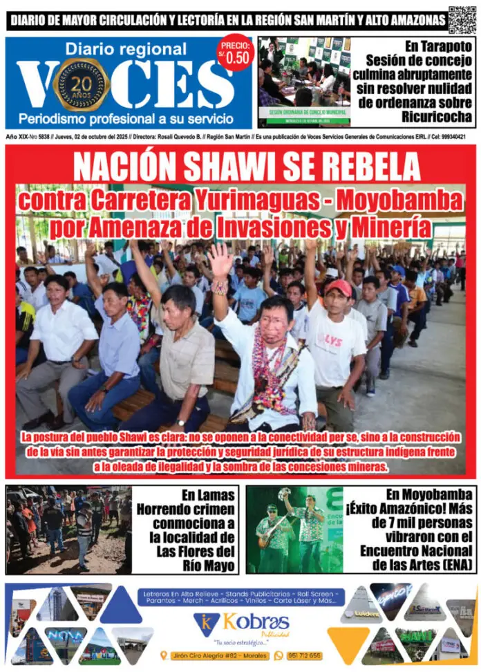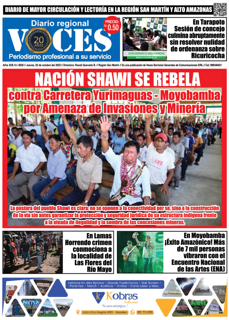 InicioActualidad ActualidadPortada del día Portada, jueves 02 de octubre 2025 By Voces 02/10/2025 2 FacebookTwitterWhatsAppLinkedinTelegram TagsDestacadoPortada del día Cuota FacebookTwitterWhatsAppLinkedinTelegram Artículo anteriorIIAP impulsa estudios de reproducción artificial de la palometa en la región UcayaliArtículo siguienteNación Shawi se rebela contra Carretera Yurimaguas – Moyobamba por Amenaza de Invasiones y Minería Artículos relacionados Actualidad Yurimaguas en alerta: La delincuencia se apodera de los barrios populares Actualidad ¡Éxito Amazónico! Más de 7 mil personas vibraron con el Encuentro Nacional de las Artes (ENA) 2025, en Moyobamba Actualidad Horrendo crimen conmociona a la localidad de Las Flores del Río Mayo Mantente conectado34,742FansMe gusta478SeguidoresSeguir1,851SeguidoresSeguir ÚLTIMOS ARTÍCULOS Actualidad Yurimaguas en alerta: La delincuencia se apodera de los barrios populares Actualidad ¡Éxito Amazónico! Más de 7 mil personas vibraron con el Encuentro Nacional de las Artes (ENA) 2025, en Moyobamba Actualidad Horrendo crimen conmociona a la localidad de Las Flores del Río Mayo Actualidad Sesión de concejo en San Martín culmina abruptamente sin resolver nulidad de ordenanza sobre Ricuricocha Cargar más