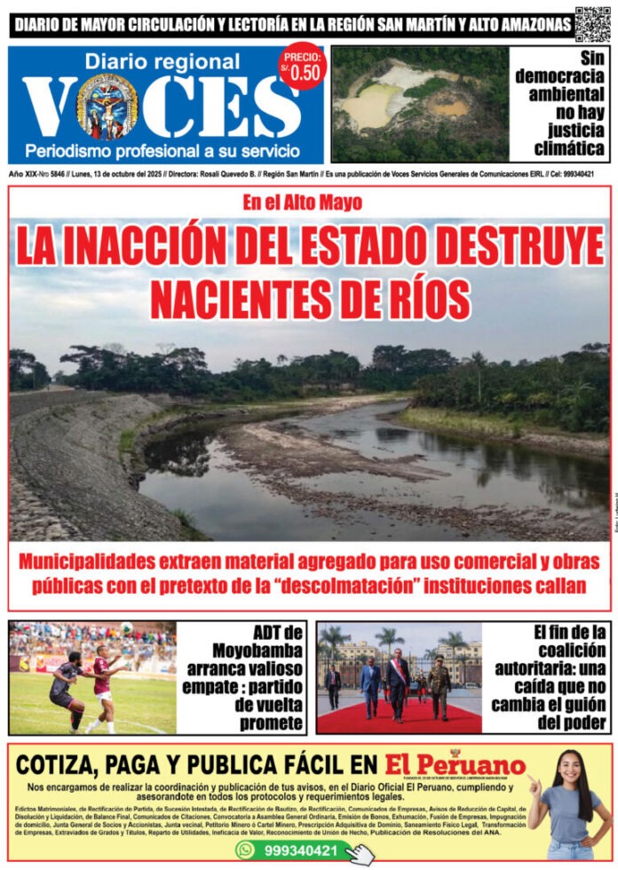 InicioActualidad ActualidadPortada del día Portada, lunes 13 de octubre 2025 By Voces 13/10/2025 3 FacebookTwitterWhatsAppLinkedinTelegram TagsDestacadoPortada del día Cuota FacebookTwitterWhatsAppLinkedinTelegram Artículo anteriorSITAPASAM CONTINÚA SU LUCHA POR LOGRAR UNA NUEVA ESCALA REMUNERATIVAArtículo siguienteDiario Digital, lunes 13 de octubre 2025 Artículos relacionados Actualidad Comic, lunes 13 de octubre 2025 Actualidad Banco de Sangre Regional San Martín y Red de Salud Rioja unen esfuerzos para salvar vidas Actualidad Asalto a mano armada en tienda de motos en La Banda de Shilcayo deja pérdidas por más de S/10 mil Mantente conectado34,742FansMe gusta478SeguidoresSeguir1,851SeguidoresSeguir ÚLTIMOS ARTÍCULOS Actualidad Comic, lunes 13 de octubre 2025 Actualidad Banco de Sangre Regional San Martín y Red de Salud Rioja unen esfuerzos para salvar vidas Actualidad Asalto a mano armada en tienda de motos en La Banda de Shilcayo deja pérdidas por más de S/10 mil Actualidad DIVMCTID Huallaga detiene a dos personas e incauta 11.452 kg de droga en San Martín Cargar más