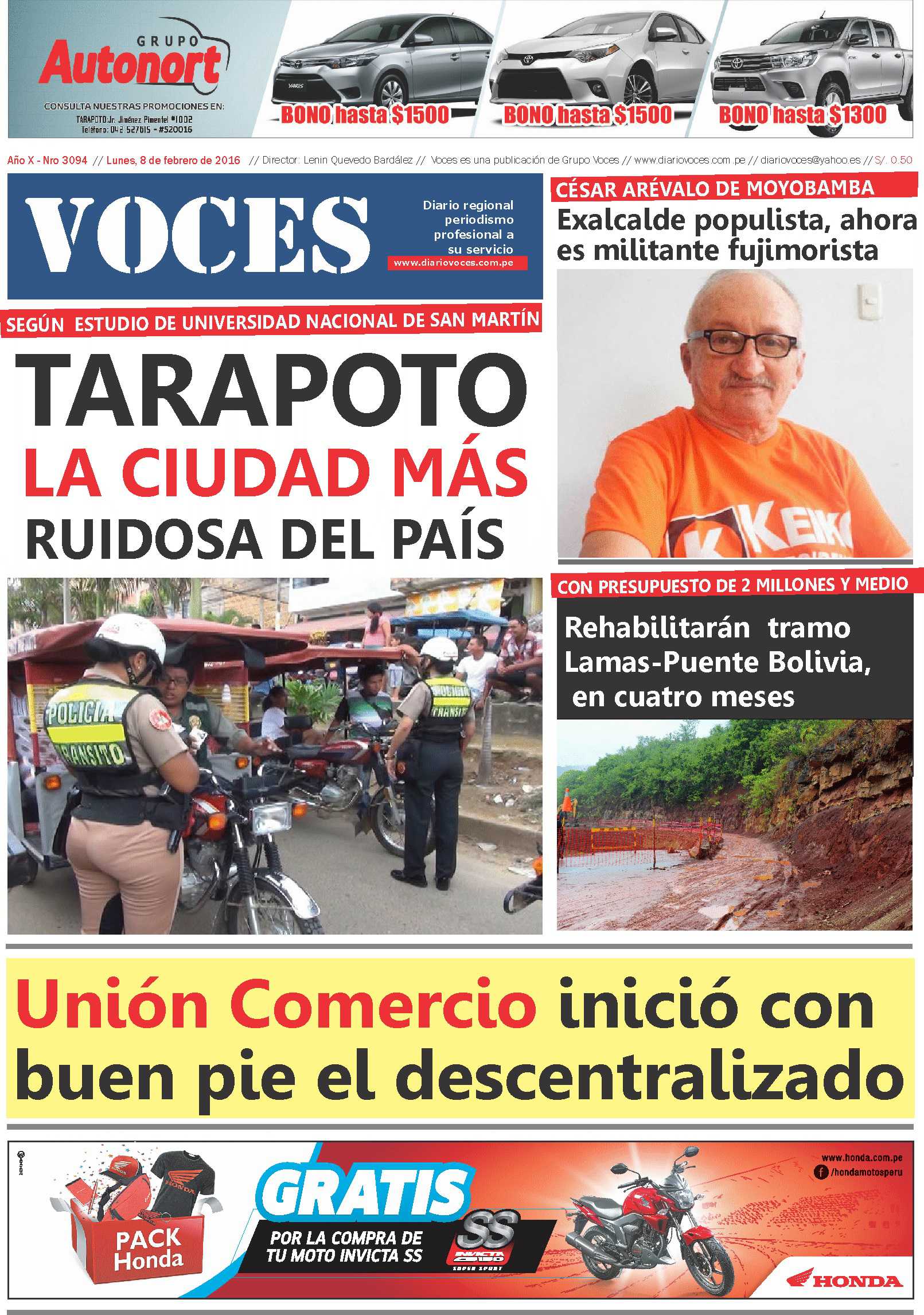 Portada del lunes 8 de Febrero del 2016