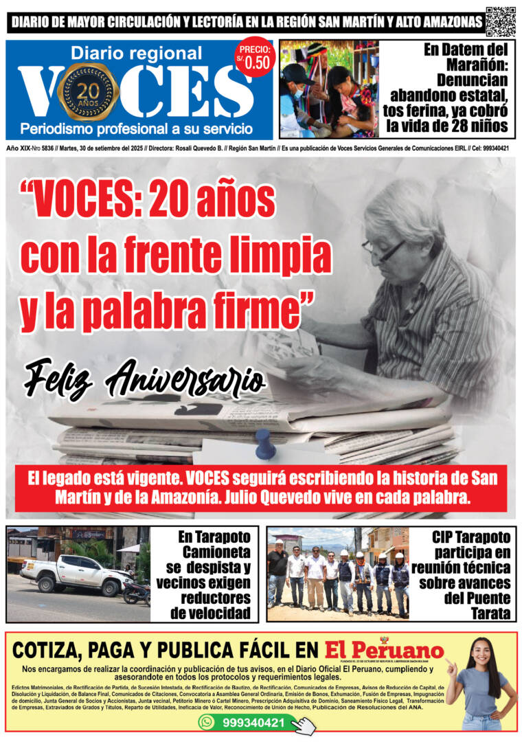 InicioActualidad ActualidadPortada del día Portada, martes 30 de setiembre 2025 By Voces 30/09/2025 15 FacebookTwitterWhatsAppLinkedinTelegram TagsDestacadoPortada del día Cuota FacebookTwitterWhatsAppLinkedinTelegram Artículo anteriorHuachitas, lunes 29 de setiembre 2025Artículo siguienteDiario Digital, martes 30 de setiembre 2025 Artículos relacionados Actualidad Prrueba Actualidad Presidente ejecutivo de EsSalud afirma que estrategia para gestión de citas y cirugías reducirá significativamente los tiempos de espera Actualidad Cuarto Poder destapa red de favores familiares y viáticos en despacho de la congresista Lucinda Vásquez Mantente conectado34,742FansMe gusta478SeguidoresSeguir1,851SeguidoresSeguir ÚLTIMOS ARTÍCULOS Actualidad Prrueba Actualidad Presidente ejecutivo de EsSalud afirma que estrategia para gestión de citas y cirugías reducirá significativamente los tiempos de espera Actualidad Cuarto Poder destapa red de favores familiares y viáticos en despacho de la congresista Lucinda Vásquez Actualidad Conoce la fórmula infalible de EsSalud para renovar el optimismo y la vitalidad de más de 63 mil asegurados de la tercera edad Cargar más