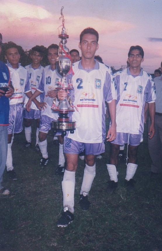 Texto de Imagen: El ahora Ing. Fernández, mostrando el trofeo ganado por su equipo de la Universidad Nacional de San Martín, hace años atrás, pese a su edad Fernández sigue jugando.