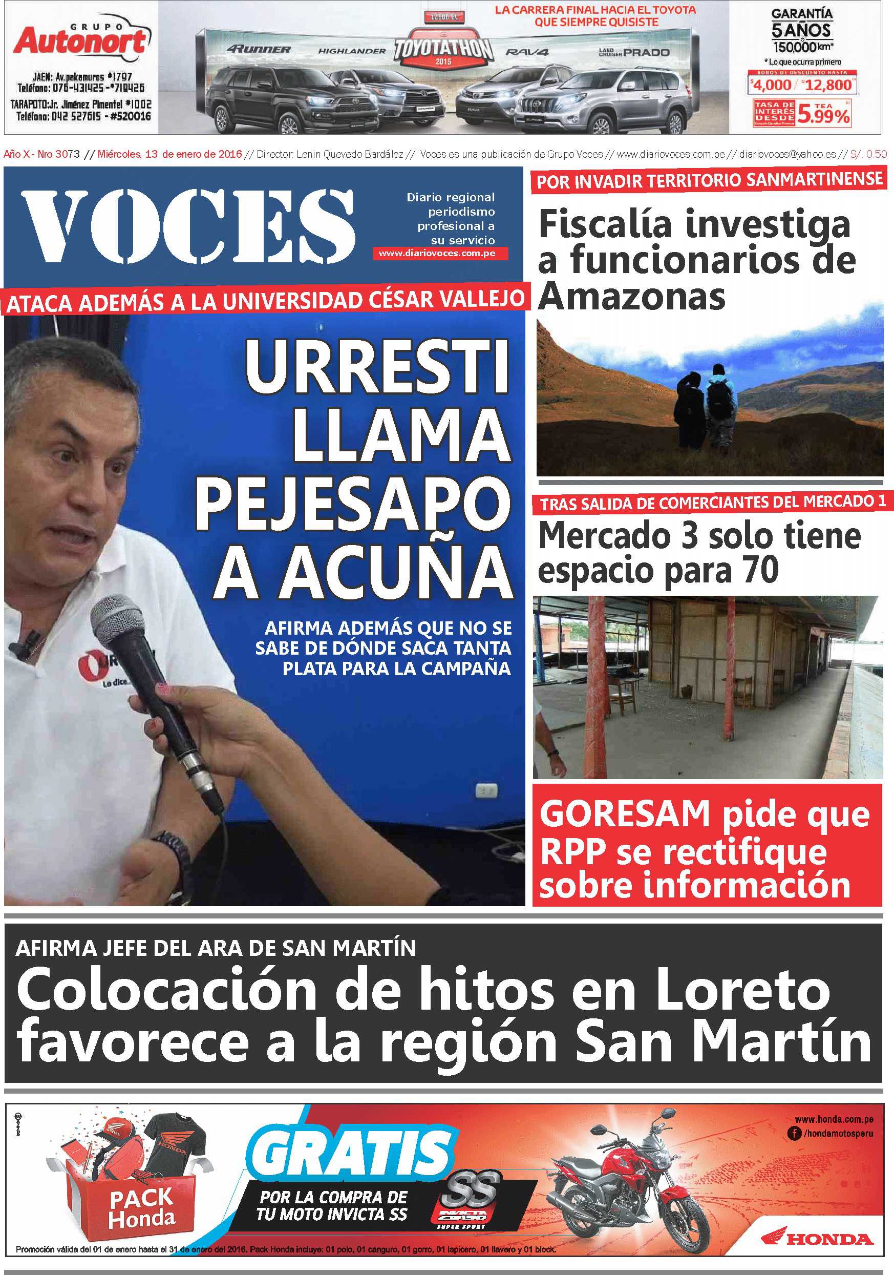 Portada del Miércoles 13 de enero del 2016