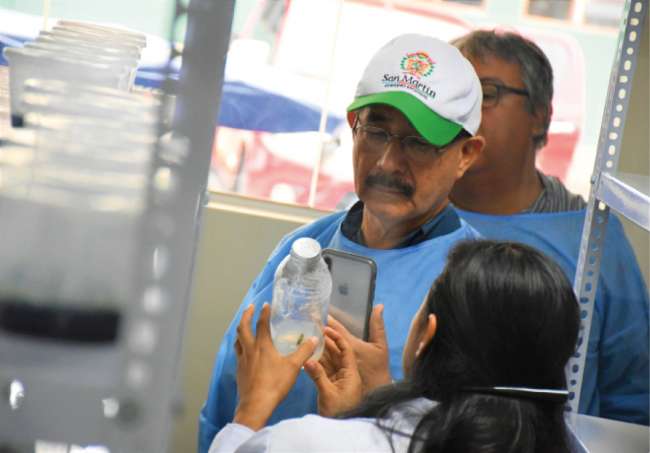 En su visita, acompañado por los directores de Agricultura Daniel Vásquez Cenepo, y de la Estación Experimental El Porvenir Kennedy Pacifico Farje Alva, recorrió los ambientes de las nuevas instalaciones de los laboratorios de Biotecnología Vegetal, donde se realizan investigaciones de cultivo in vitro de plantas, en el marco de la actividad “Adaptación de técnicas de micropropagación para la clonación de genotipos selectos de cacao” que se desarrolla en mérito a la alianza estratégica entre estas dos instituciones.