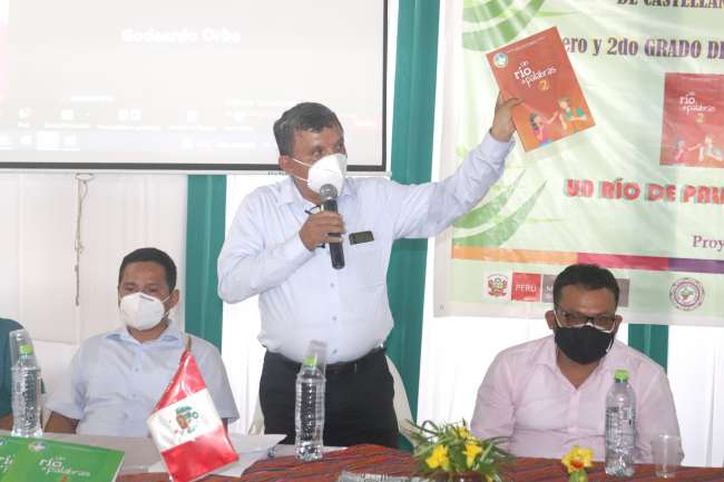 Texto de Imagen: Director de UGELAA Luis Moreno, presenta cuadernos de castellano como segunda lengua