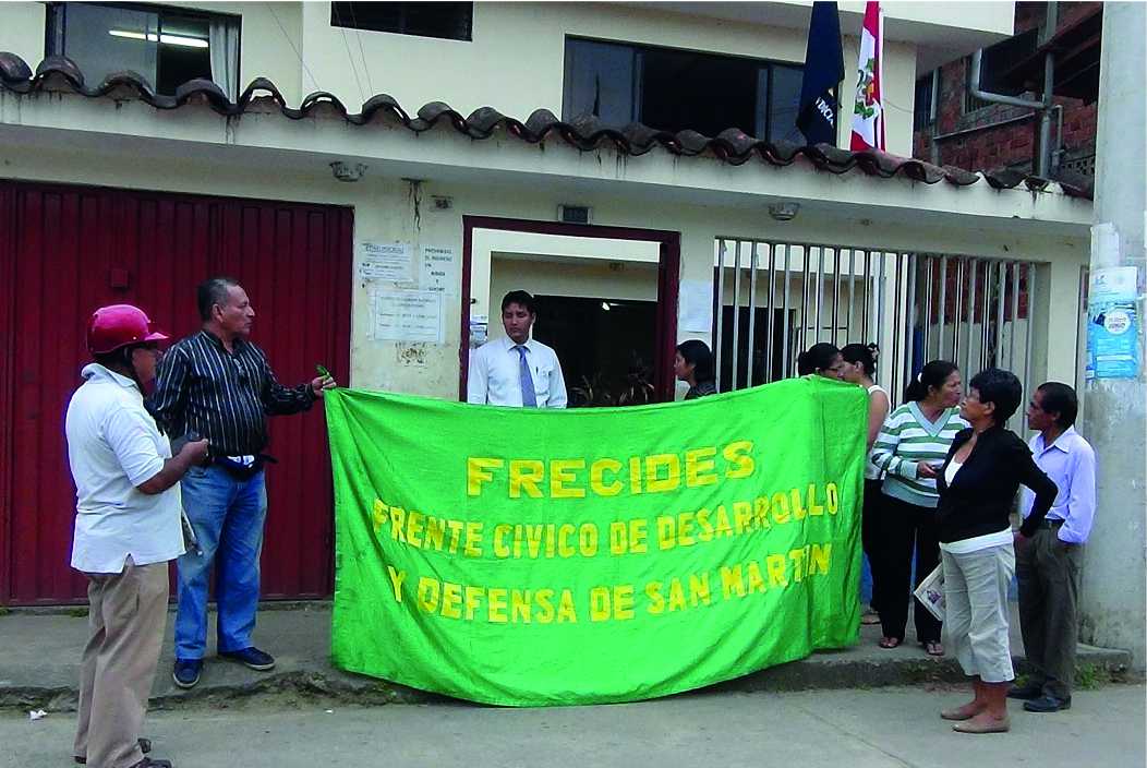 Los dirigentes del Frente Cívico de Defensa de los Intereses de San Martín (FRECIDES) protestaron ayer por la mañana en el frontis del Juzgado Civil de Tarapoto, en momentos que el abogado Gabriel Alejandría Castro, presentaba una demanda de constitucionalidad de cumplimiento contra el decano del Colegio de Notarios de la región, porque hasta el momento los nuevos notarios no son incorporados.