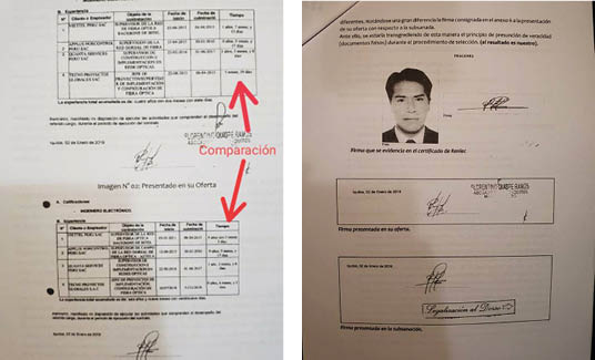 Además el denunciante afirma que los de Tecno Proyecto Globales, no solo habrían presentado un documento con una firma aparentemente falsa, hecho que se confirmaría en el documento de subsanación, la misma que presenta una firma totalmente diferente al documento presentado en la etapa de ofertas. Además habrían modificado los contenidos en el ítem de años de experiencias, en la que se verifica que en la presentación de ofertas, el ingeniero Rildo Flores Torres, tiene 5 meses, 29 días de experiencia. Pero en el documento de subsanación este mismo profesional tiene, de 0 años, 6 meses 1 día de experiencia.