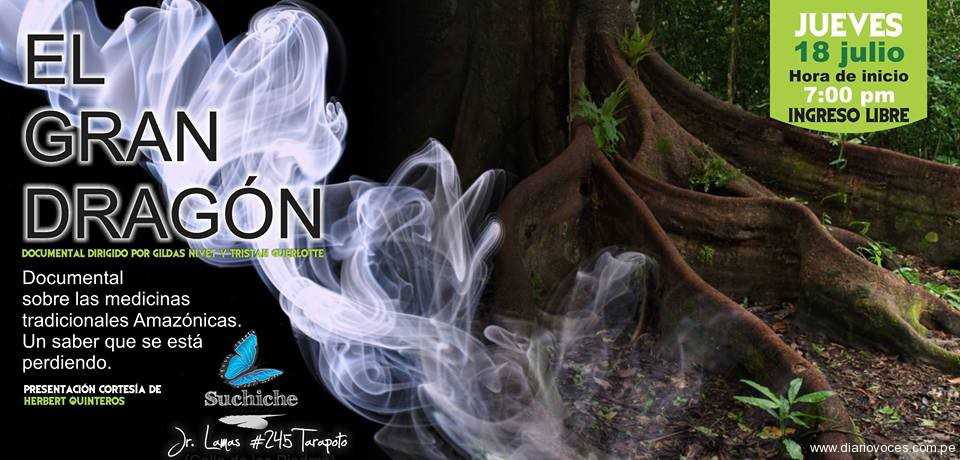 Tarapoto. Esta noche en el local de Suchiche Café, se realizará la presentación del documental El Gran Dragón, que trata sobre la medicina tradicional de la amazonía peruana que vuelve a sus orígenes y quiere desvelarse delante de sus protagonistas. Va en búsqueda del rescate de los saberes ancestrales, poniendo en tela de juicio la influencia de la sociedad occidental. La película documental se proyectará a las 7:00 de la noche.