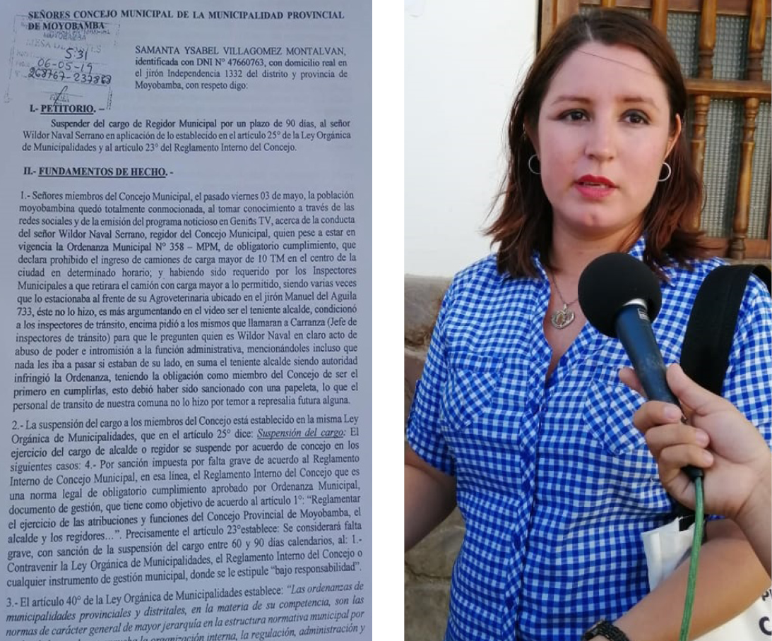 Moyobamba. Con fecha 06 de mayo a las 5 con 31 minutos de la tarde, ingresó a la Municipalidad Provincial de Moyobamba, el pedido de suspensión por 9 meses contra el primer regidor Wildor Naval Serrano. La solicitud fue hecha por la comunicadora social Samanta Villagómez Montalván con número de DNI 4766 0763 teniendo como argumento que el mencionado concejal ha incurrido en falta grave contra el Reglamento Interno del Municipio Provincial de Moyobamba, establecido en su artículo 23° y la ley orgánica de Municipalidades N°27972 en su artículo 25, al haber hecho uso del poder que ejerce en calidad de primer regidor para evitar que un inspector de tránsito le aplique la sanción al haber infringido la Ordenanza Número 358 que prohíbe el estacionamiento o descargue de vehículos pesados superior a las 10 toneladas en las calles céntricas de esa ciudad.