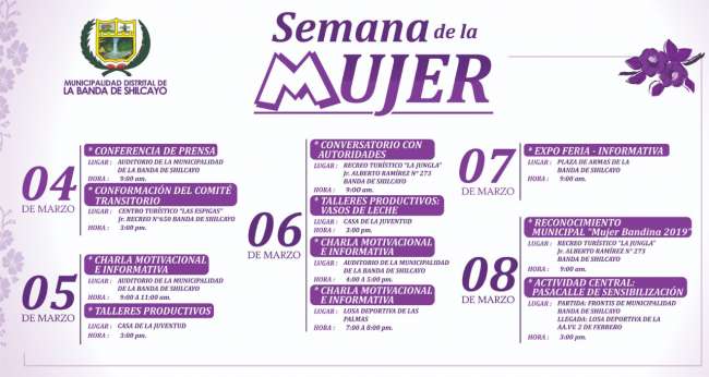 El día central (8 de marzo), la Municipalidad Distrital de La Banda de Shilcayo, reconocerá a la Mujer Bandina 2019, con testimonios que dan cuenta del emprendimiento y el desarrollo de las mujeres en la mejora de condiciones no solamente de su hogar, sino también del distrito.
