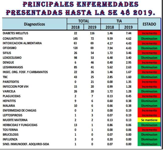 Entre las principales enfermedades en las que se obtuvo un incremento en lo que va del año 2019 están: la diabetes, intoxicación alimentaria, sífilis, dengue, parotiditis, infección por VIH, plaguicida, enfermedad de chagas, leptospirosis y tos ferina.