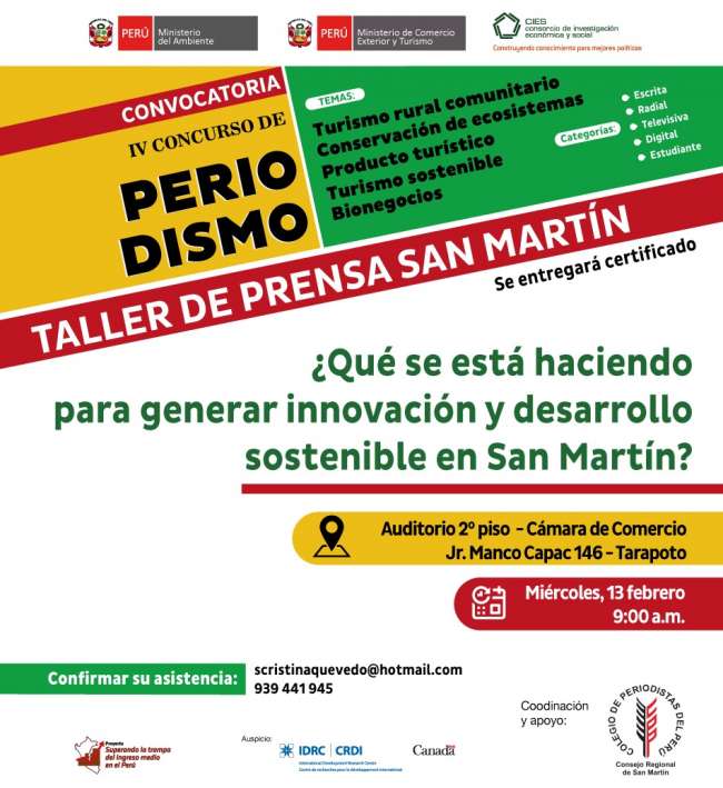 El Colegio de Periodistas de San Martín y el Consorcio de Investigación Económica y Social (CIES), institución que representa al sector académico del país, tienen realizan e El Concurso busca motivar en el periodismo la difusión de actividades sostenibles que se realizan en las regiones de Cusco, Madre de Dios y San Martín vinculadas a los avances, oportunidades y desafíos de los peruanos en los siguientes temas: bionegocios, conservación de ecosistemas, turismo sostenible, turismo rural comunitario y producto turístico.