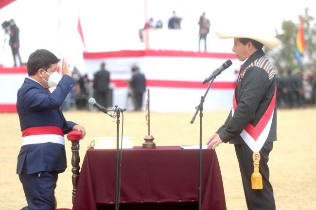 El presidente de la República, Pedro Castillo Terrones, juramento a Guido Bellido Ugarte como presidente del Consejo de ministros. Bellido Ugarte, congresista de Perú Libre por la región del Cusco, juró en español y quechua.