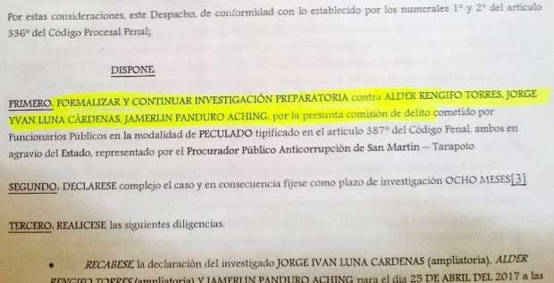 El equipo de prensa de Decisiones tuvo acceso a documentación que da cuenta del proceso de formalización y continuación de la investigación al director de la Red de Salud de Picota, Jorge Iván Luna Cárdenas, investigado por el presunto delito de peculado doloso; además, la carpeta fiscal refiere también que se le imputa al actual director de la red, Luna Cárdenas y Jamerlin Panduro Aching, exdirector del hospital de Picota, el haber favorecido la apropiación de caudales a un tercero Alder Rengifo Torres, consejero, presidente de la Comisión de fiscalización del Consejo Regional, formalización y continuación de la investigación preparatoria presentada por el procurador público Anticorrupción de San Martín.
