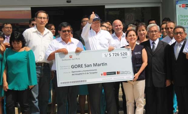 Tarapoto. El presidente de la República Pedro Pablo Kuczynski tras llegar a Tarapoto junto varios ministros de Estado, se dirigió al moderno hospital donde manifestó que su gobierno va a poner en funcionamiento los nuevos nosocomios de la región. También entregó simbólicamente al gobernador regional, un chede 5 millones 700 mil soles para la operatividad del hospital.