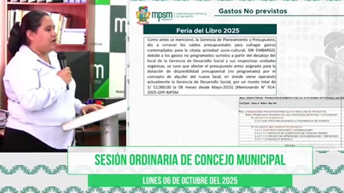 Durante una sesión de comuna extraordinaria realizada en el despacho de alcaldía de la Municipalidad Provincial de San Martín, la gerente de Desarrollo Social, Gisell Andy Pisco Jaramillo, sorprendió a los regidores al informar que el presupuesto destinado para la Feria del Libro de Tarapoto fue utilizado para el alquiler de un nuevo local donde actualmente funcionan algunas oficinas del municipio.
