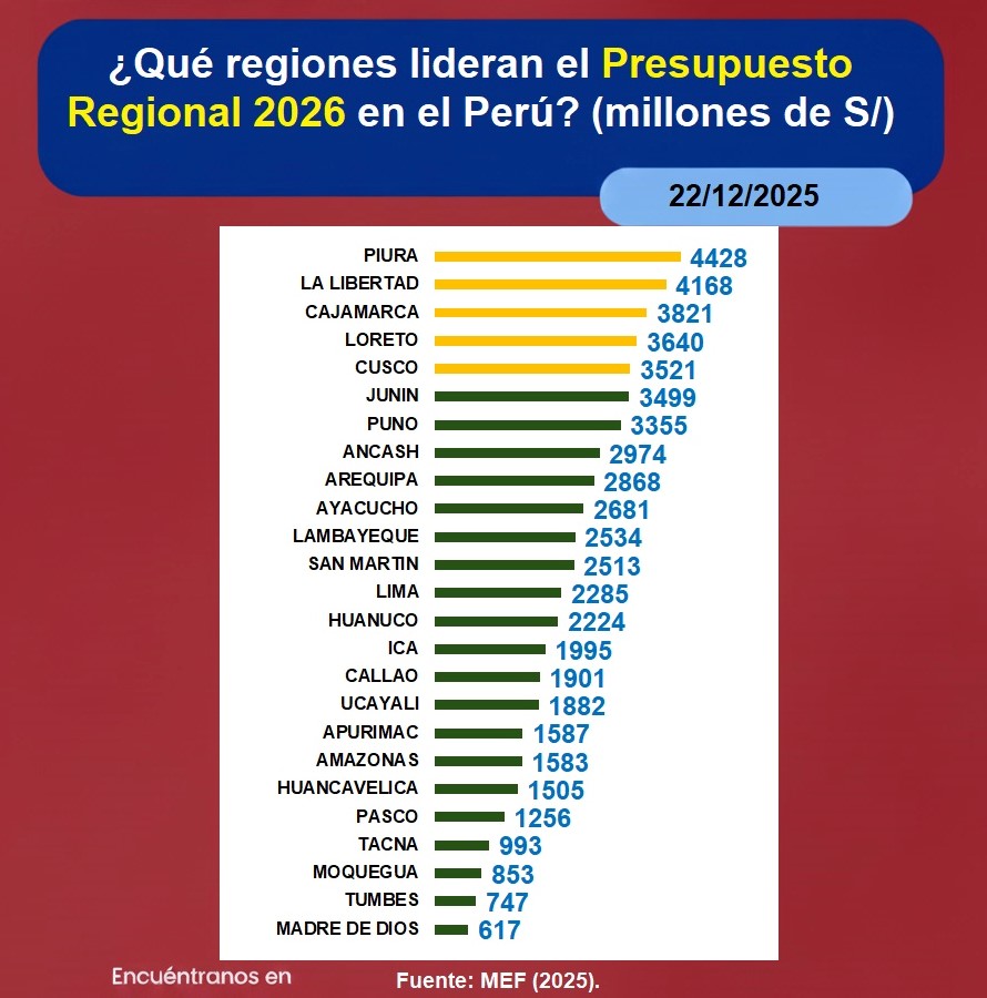 El Presupuesto Regional 2026, aprobado en el marco del Presupuesto General de la República, vuelve a mostrar un mapa desigual del desarrollo territorial en el Perú. Las cifras oficiales del Ministerio de Economía y Finanzas (MEF) revelan qué regiones concentran mayores recursos públicos y, al mismo tiempo, exponen las urgencias estructurales de aquellas que, pese a su rol estratégico, aún reciben asignaciones que resultan insuficientes frente a sus necesidades reales.