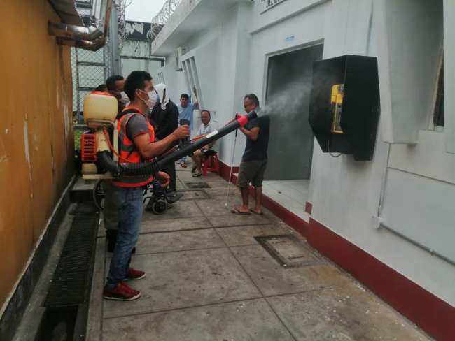 Continuando con las acciones de prevención a fin de evitar la propagación del Covid- 2019, las autoridades del Instituto Nacional Penitenciario –INPE, en coordinación con el sector salud, Municipalidad Provincial, Eps Moyobamba, Colectivo Moyobamba y otras instituciones, ayer lunes se llevó a cabo la jornada de limpieza y desinfección de todos los ambientes del penal San Cristóbal, centro carcelario que alberga a más de 800 presos. Las actividades se desarrollaron desde horas de la mañana, habiéndose utilizado agua con dosis de cloro, que fue aplicado en los pisos, rejas, puertas y otras instalaciones de la parte interna y externa. Es importante mencionar que este tipo de medidas también se ejecutó el último fin de semana en las calles y plazas de toda la ciudad cuatricentenaria, donde se usó vehículos cisterna que cedió la Eps Moyobamba. El trabajo es posible gracias a la labor mancomunada que se viene teniendo entre las instituciones públicas, privadas, organizaciones de base y colectivos que de antemano piden a la población a acatar las medidas aprobadas por el gobierno, de mantenerse en casa y así evitar la propagación e incremento de casos confirmados del coronavirus. (Franclin Laván)