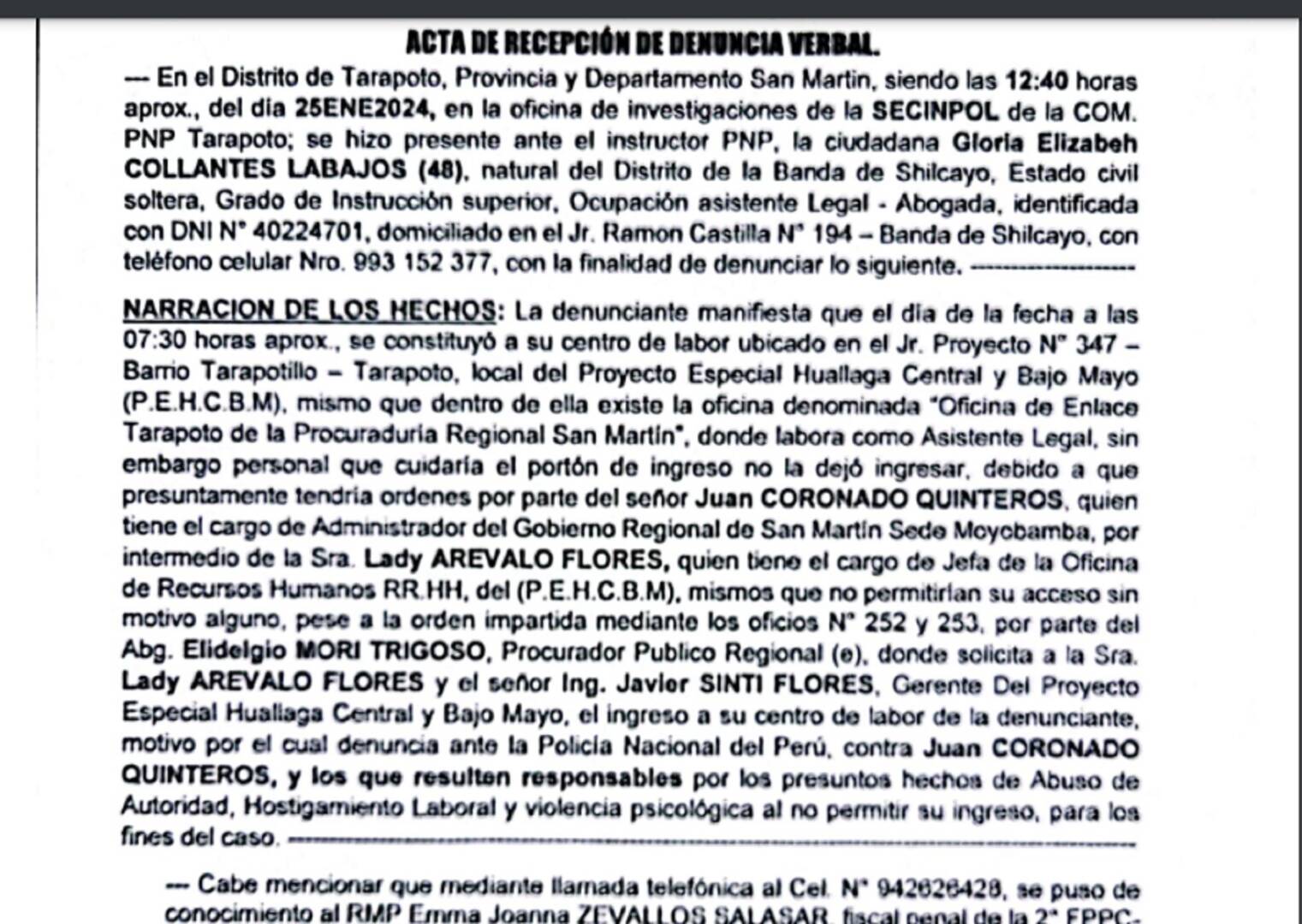 En un caso sui generis, Elidelgio Mori Trigozo, Procurador Público Regional de San Martín, amenazó con denunciará a Juan Coronado Quintero, administrador del Gobierno Regional de San Martín – GORESAM, por el simple hecho de no permitir el ingreso al Proyecto Especial Huallaga Central y Bajo Mayo – PEHCBM, de Gloria Collantes Labajos, personal de la Procuraduría Regional sin ningún tipo de vínculo contractual con la señalada unidad ejecutora del Gobierno regional.