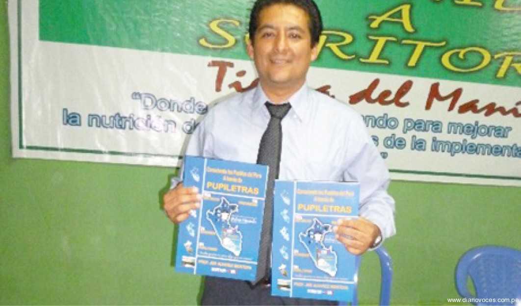 Soritor. El profesor Joe Álvarez Montoya, especialista en Biología y Química, hizo la presentación de su primer libro titulado Conociendo los pueblos del Perú a través de pupiletras, en el auditorio municipal el día miércoles 08 de octubre a las 8 de la noche.