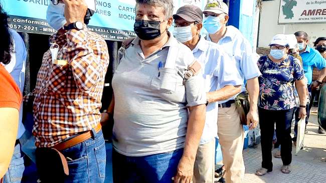 Maestros en actividad, cesantes y jubilados hicieron largas colas desde tempranas horas de la mañana en el frontis de la Unidad de Gestión Educativa Local San Martín, para recibir su cheque por concepto de preparación de clases, dinero que ganaron a través de un juicio que un grupo de profesores realizaron a través del poder judicial. Los docentes, dijeron que no existía lógica que, teniendo sus cuentas en el Banco de La Nación, les entregaban de esta manera, más aún cuando existe la tercera ola de la pandemia.