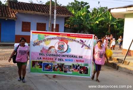 Saposoa. La Municipalidad Provincial de Huallaga realizó un vistoso pasacalle por las diferentes arterias de esta ciudad, con la finalidad de difundir las actividades del Centro de Promoción de Vigilancia Comunal del Cuidado Integral de la Madre y el Niño que está ubicado en el barrio “Francisco Izquierdo Ríos”.
