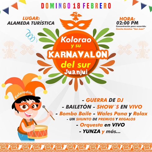 “Kolorao y su Carnavalón del Sur” consistirá en una tarde de guerra de DJ, bailetón, show en vivo, bombo baile, Wales Pana y Rolax, orquesta en vivo y Umsha, a realizarse en la Alameda de Juanjuí. (Carlo Auguso)