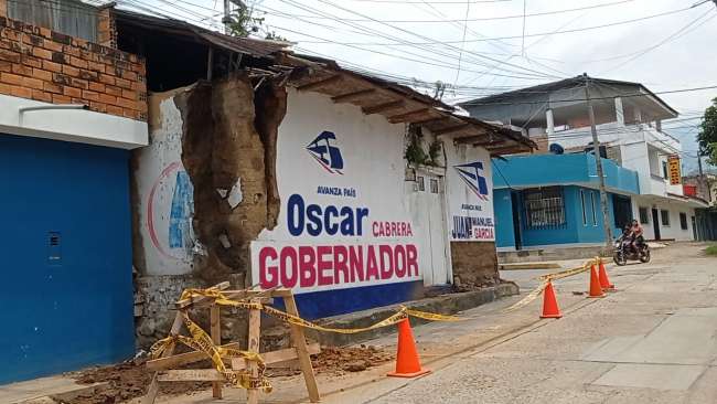 Los pobladores que viven en la intersección del Jr. San Pablo de la Cruz con el Jr. Juanjui, en el centro de Tarapoto, se mostraron temerosos que una precaria vivienda ubicada en la misma esquina colapse y los aplaste. Ante el inminente peligro, la Municipalidad Provincial de San Martín procedió a colocar conos y cintas de seguridad.