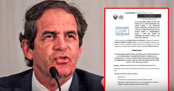 Se conoció que el parlamentario Roberto Chiabra presentó un proyecto de ley para realizar una reforma constitucional del Poder Judicial y el Ministerio Público. De acuerdo a la iniciativa se pretende modificar los artículos 144 y 158 de la Constitución Política que está relacionado al nombramiento, plazo y cese del cargo de los máximos titulares de estas entidades autónomas.
