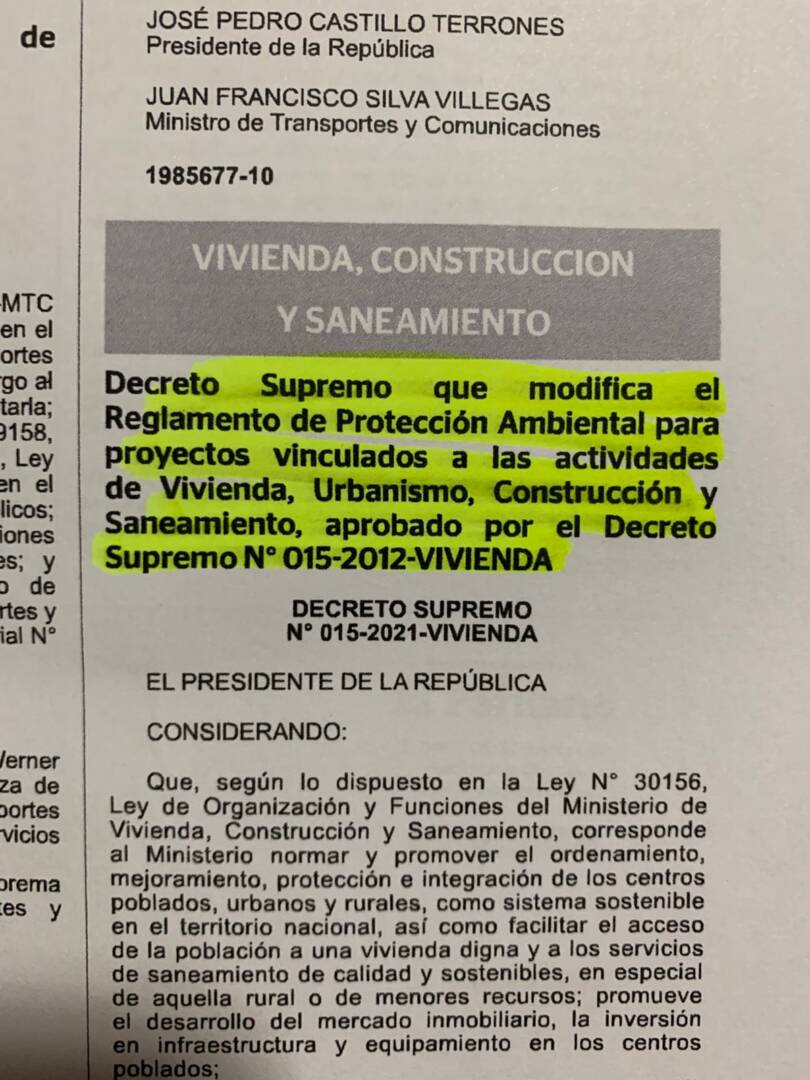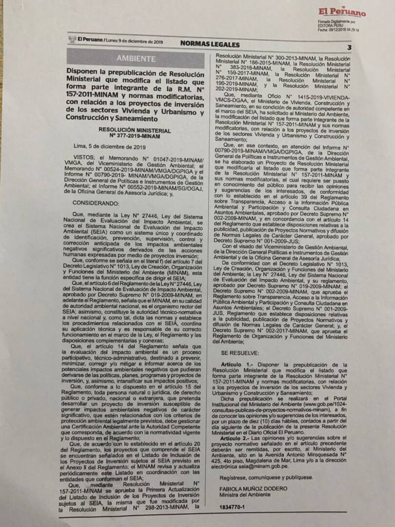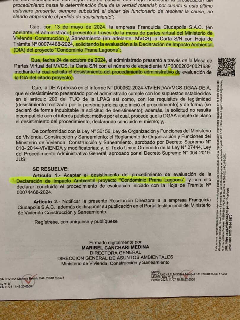 La empresa presentó un instrumento de gestión ambiental que fue observado con 40 observaciones: 09 por el SERFOR. 04 por la Autoridad Nacional del Agua (ANA). 27 por la Dirección de Evaluación de Impacto Ambiental del Ministerio de Vivienda.