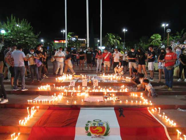 Para honrar a los dos jóvenes que dieron su vida por la democracia, la noche de ayer domingo, familias enteras elevaron sus oraciones por los caídos y heridos desde la plaza de armas de Tarapoto.