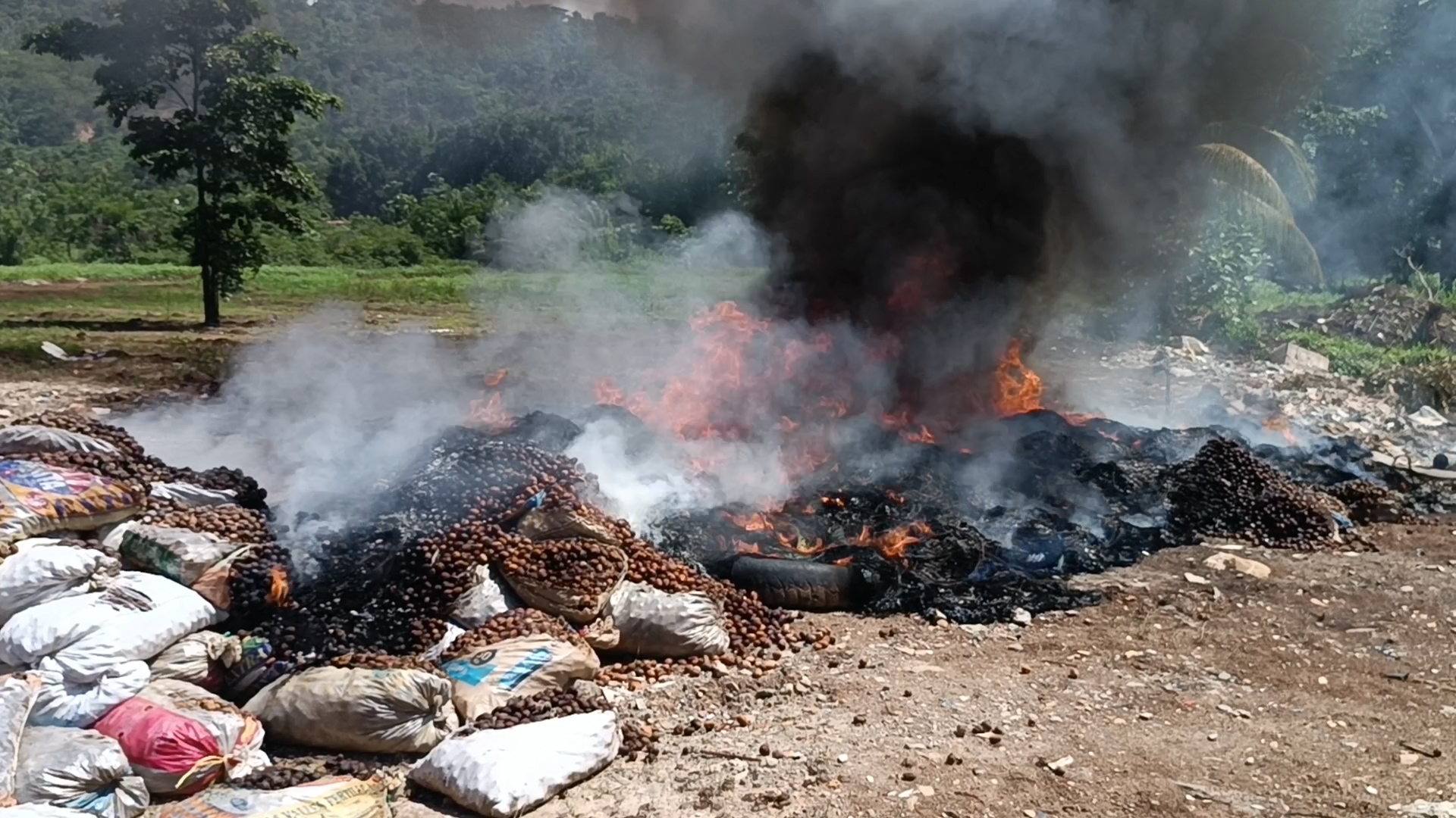 Por más de dos horas, el fuego consumió llantas de diversos vehículos y más de cien sacos de semillas de aguaje, cerca de la carretera que conduce al distrito de San Antonio de Cumbaza, generando una gran cantidad de humo tóxico y provocando el malestar de los vecinos, quienes denunciaron el hecho ante las autoridades. (Hugo Anteparra)