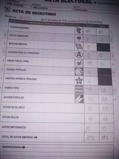 ¿Acción Popular se colude con los fujimoristas?, en Bellavista parece que si, ya que presentan nulidad de acta, donde Acción Popular tuvo 5 votos, y presentan otra “verdadera”, donde los populistas aparecen ahora con 50, lo que daría el triunfo al candidato de Acción Popular
