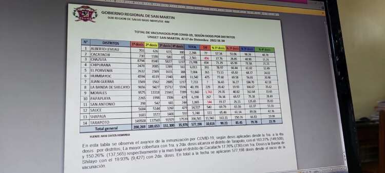Asimismo, el funcionario indicó que la inmunización de la población contribuyó en un gran porcentaje para que se pueda mitigar el efecto de la pandemia, dijo que actualmente en la provincia de San Martín existe el 78% de ciudadanos vacunados con la tercera dosis sin embargo en otras localidades necesitan concientizarse para poder completar su esquema de vacunación, a eso se suma que la ciudadanía debe aplicarse la cuarta dosis para que pueda estar inmunizado y la enfermedad no lo afecte mucho. Porque ha quedado demostrado que todas las vacunas de los diferentes laboratorios que se utilizaron para vacunar a la población resultaron tener una buena efectividad.