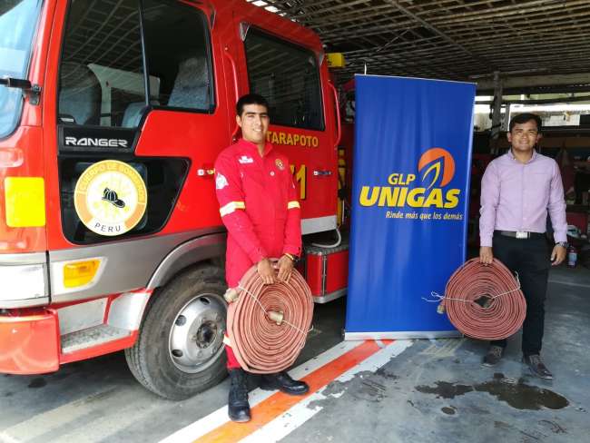 Tarapoto. Walter M. Lozano Benzaquén – Gerente General: “Como empresa queremos formar parte del bienestar de nuestra comunidad, con este objetivo, la empresa Unigas dona 2 mangueras a la compañía de bomberos de Tarapoto, sobre todo teniendo en cuenta que, a pesar de sus limitaciones, conocidas por todos, practican su profesión con pasión y amor al prójimo”, mencionó.