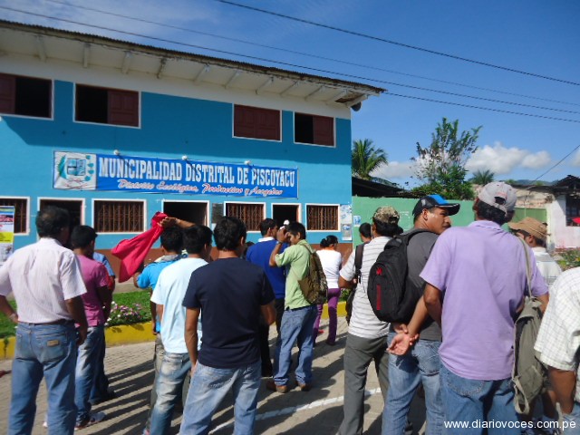 Piscoyacu. Dirigentes y pobladores del caserío Huaccha del distrito de Piscoyacu, arribaron a esta localidad para realizar un plantón en el frontis de la Municipalidad Distrital de Piscoyacu.