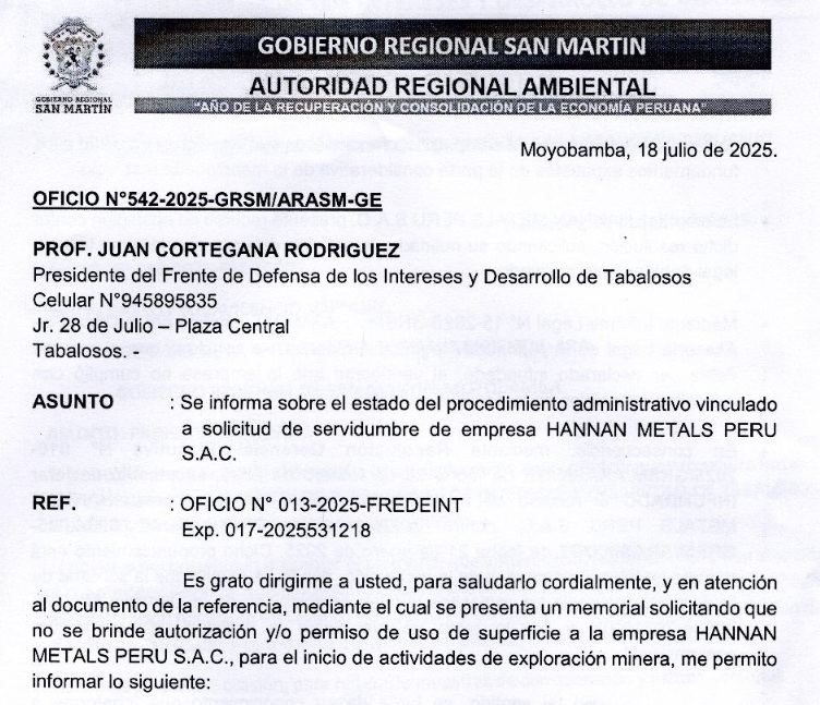 En un fallo considerado un precedente importante para la defensa de los territorios en San Martín, la Autoridad Regional Ambiental (ARASM) del Gobierno Regional de San Martín resolvió no otorgar la servidumbre convencional solicitada por la empresa Hannan Metals Perú S.A.C. para desarrollar actividades de exploración minera en el distrito de Tabalosos, provincia de Lamas.