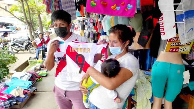 Ayer por la mañana la joven pareja llegó hasta el barrio Comercio de Tarapoto en busca de una camiseta con el apellido Lapadula para su bebé, sin embargo, manifestó que en su localidad hay niños que se llaman Neymar, Guerrero, Ronaldinho en entre otros. (Hugo Anteparra)