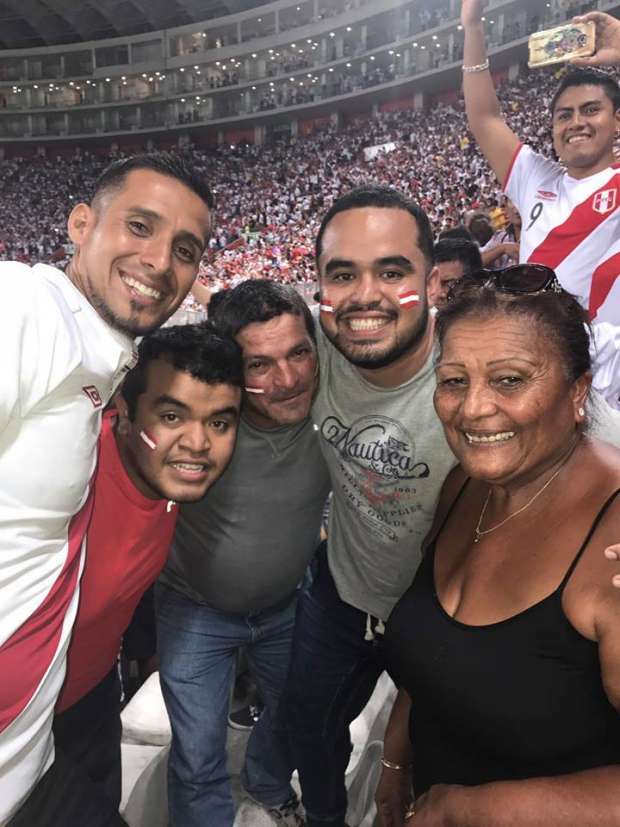En el estadio Nacional, después del partido, donde Perú derrotó por 2-1 a Uruguay. Los hinchas de la selección peruana, todos ellos tarapotinos se tomaron una lindísima placa con la Tía Peta, mamá del depredador peruano Paolo Guerrero.