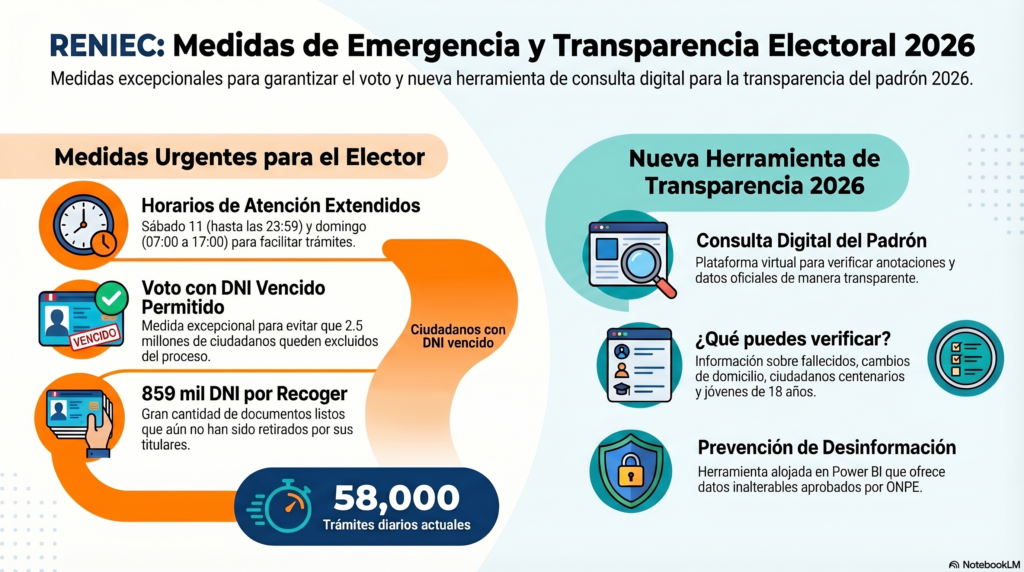 A pocos días de las elecciones del 12 de abril, el Registro Nacional de Identificación y Estado Civil (RENIEC) ha tenido que adoptar medidas excepcionales que vuelven a poner en evidencia una constante en los procesos electorales del país: la reacción tardía de la ciudadanía frente a la actualización de su documento de identidad. La decisión de ampliar horarios de atención —incluyendo fines de semana— y permitir el voto con DNI vencido no solo busca garantizar el derecho al sufragio, sino que también revela una sobrecarga institucional provocada por la alta demanda de última hora. Más de 58 mil trámites diarios reflejan un sistema que opera al límite en pleno contexto electoral.