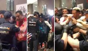 La trifulca comenzó en el momento que un efectivo policial español empujó el brazo al volante Yoshimar Yotún para que no se acercara a la gente y este reaccionó de la misma manera. Fue en ese momento que Pedro Gallese salió en defensa de su compañero.