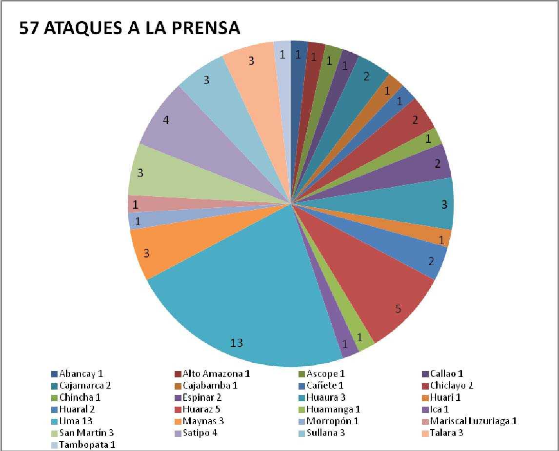 Al finalizar abril se registran en el Perú, 57 ataques contra la prensa, entre los que encuentran: asesinato, muerte por lesiones graves, tentativa de homicidio, agresiones físicas y verbales, amenaza/hostigamiento, presiones jurídicas, presiones administrativas, trabas al ejercicio periodístico y robo por asalto de equipos, debido a la situación de inseguridad que vive el país.