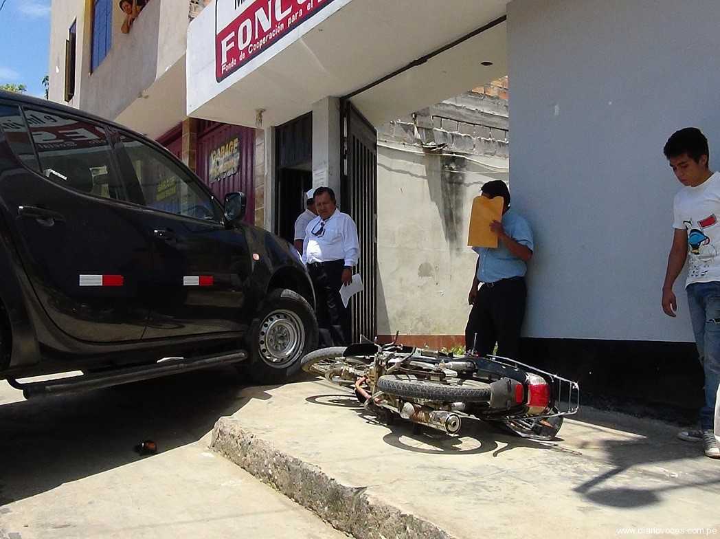 Parcialmente averiada quedó una motocicleta, tras un accidente de tránsito ocurrido en la segunda cuadra del jirón Sucre de Tarapoto, algunos transeúntes responsabilizaron al conductor de la camioneta de FONCODES, quien habría tratado de ingresar de manera intempestiva a esa entidad gubernamental.